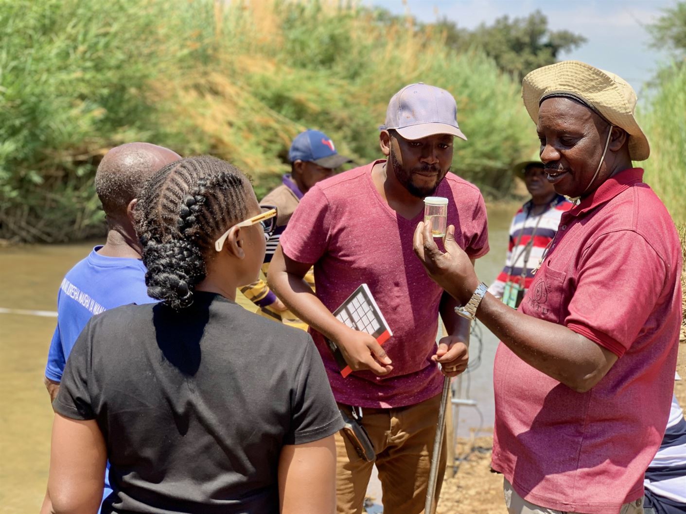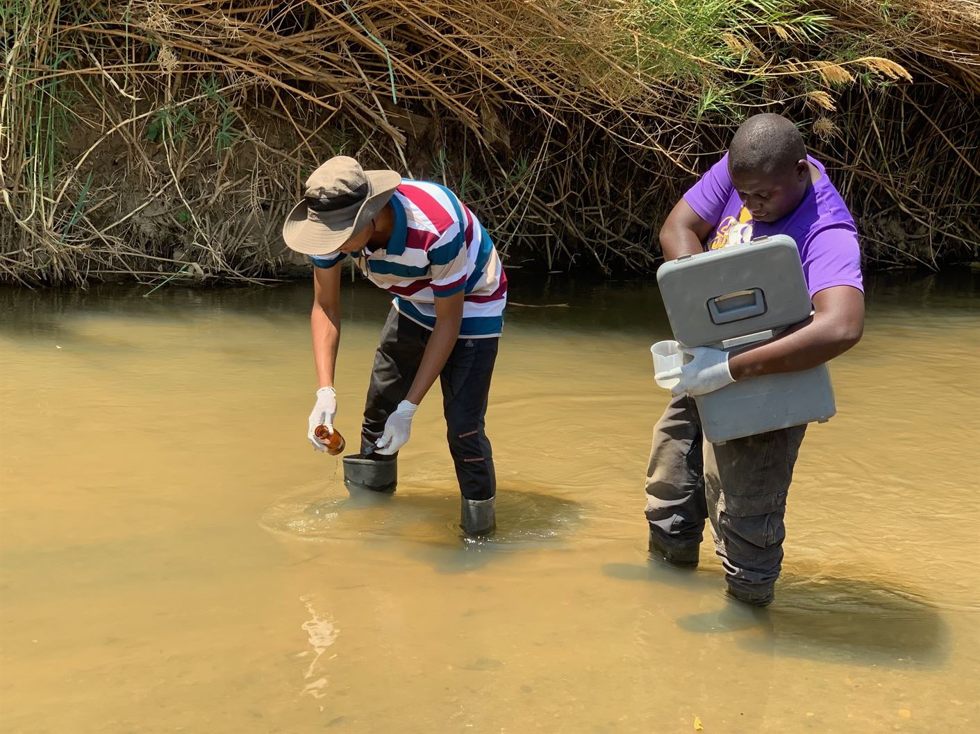 kushoto ni Mtaalamu wa Ubora wa Maji bwana Rajabu Mohamedi akichukua sampuli za maji kwa ajili ya utafiti wa ubora wa maji.
