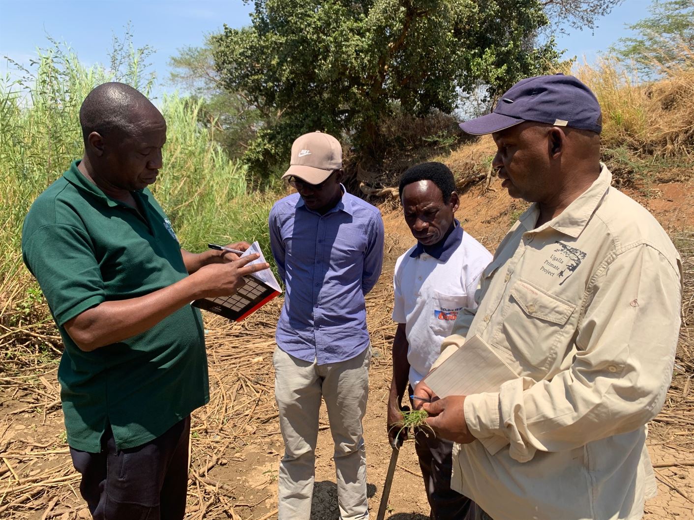 Kushoto ni Papilon Mkome akichukua taarifa za mimea iliyotambuliwa katika zoezi la kukusanya taarifa za mimea ya Mto Mbarali, anayemfatia ni Dr Emmanuel Mwakinunu na kulia ni Mtaalamu wa Mimea Yahya Mafumbi