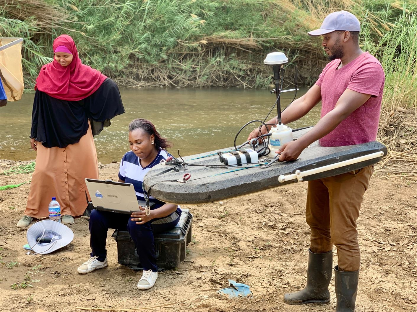 Kulia ni Mtafiti Nyemo Chilagane na katikati ni Fundi Sanifu Haidrolojia Kalister Elizea wakifanya urekebishaji (calibration) wa kifaa cha kupimia wingi na mtiririko wa maji (ADCP River_Surveyor )