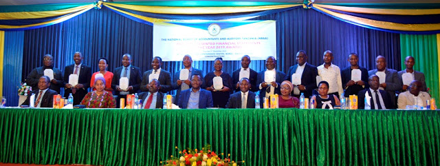 Dr. Charles Mwamaja poses with the second winners of the Best Presented Financial Statements for the year 2019 Awards presented by the National Board of Accountants and Auditors of Tanzania (NBAA)